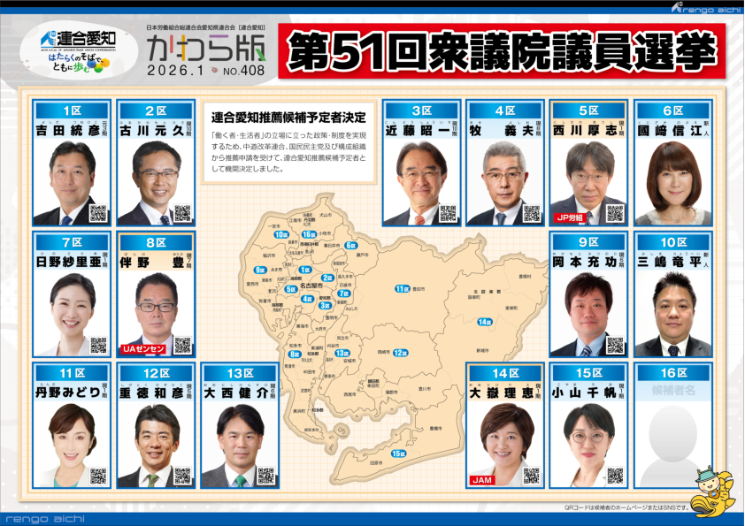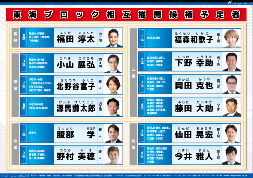 連合愛知では、第51回衆議院議員選挙の推薦候補予定者を下記の通り決定しました。