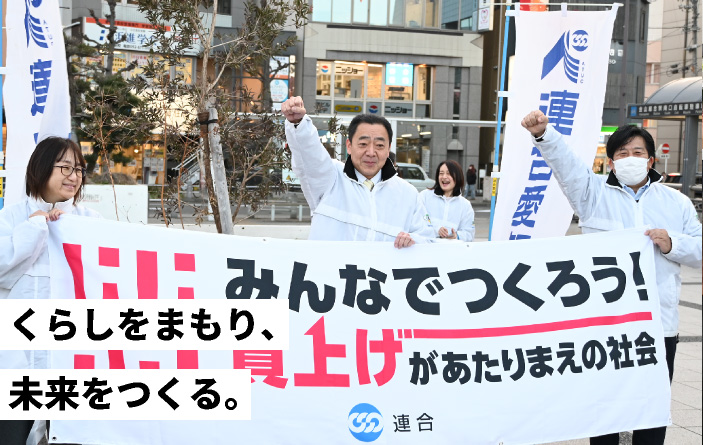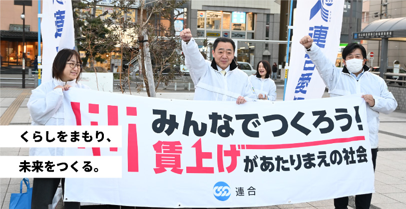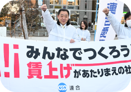大きな会社だけでなく中小の会社やパート・派遣で働くみなさんの待遇も改善できるよう、経営者団体や行政に粘り強く働きかけているよ!