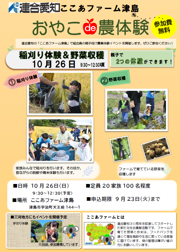 - ここあファーム津島 2025年秋イベント「稲刈り体験・野菜収穫」参加者募集!