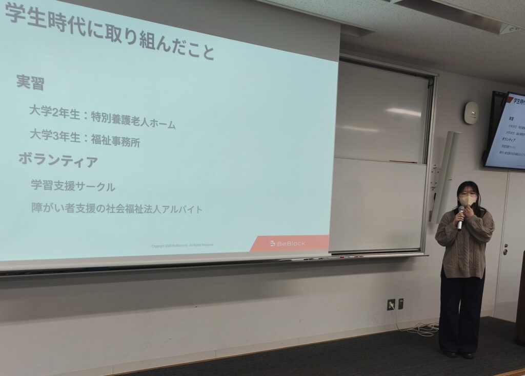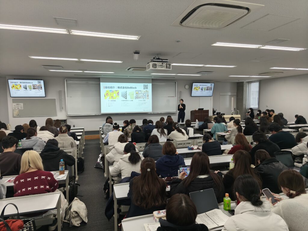 本学卒業生を招き、在学生向けキャリア講座を実施しました。今回は株式会社BeBlockで活躍する 2名を講師としてお迎えし、大学時代の学びから現在の仕事内容、社会人として感じた変化や働く上で大切にしていることなどを語っていただきました。