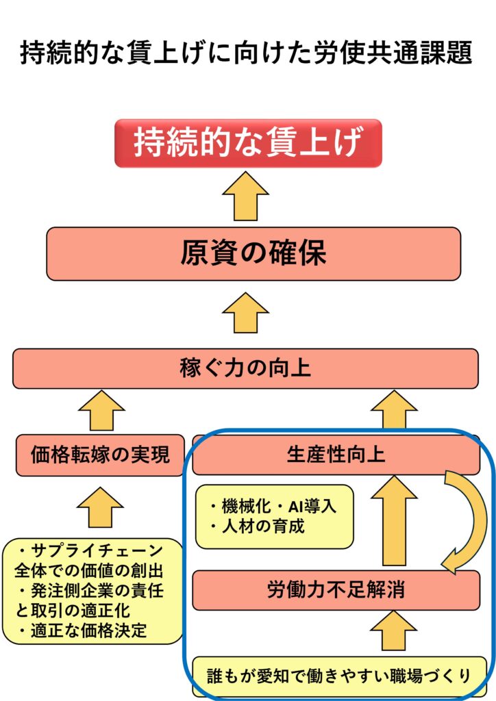 持続的な賃金の引き上げについては、”労働力不足の解消”と”生産性向上”が労使共通の課題となっていることから、これをテーマとして意見交換をしました。