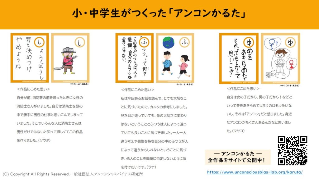 印象的だったのは、子どもたちがアンコンシャスバイアスについて学び制作した「アンコンかるた」の紹介です。読み札を募集した際、「さすがに『ん』から始まる札は出てこないだろう」と思っていたそうですが、実際には応募があったとのことでした。「“ん”はないかもしれない」と考えたその思い込み自体が、アンコンシャスバイアスだったのです。子どもたちの柔軟な発想力は、大人の固定観念を軽やかに越えていきます。